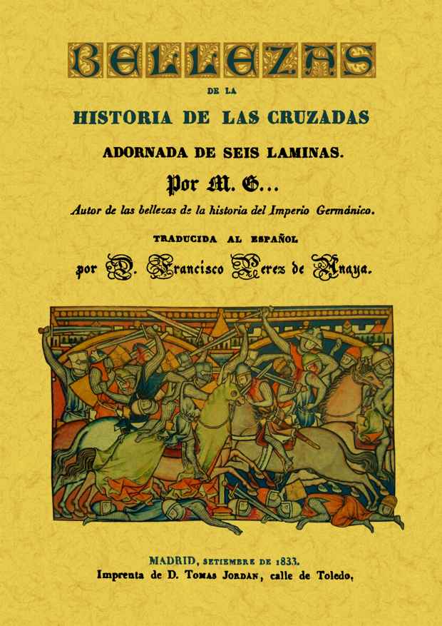 Obra que contiene las épocas y hechos más memorables de la historia de las cruzadas, los rasgos de heroísmo, las expresiones célebres, las batallas y sitios más notables, y particularmente la conquista y pérdida de Rodas, el sitio de Malta, la abolición de la orden de los templarios, las guerras de los teutónicos y una noticia acerca de otras muchas órdenes de caballería. Se adorna esta obra con seis láminas.
