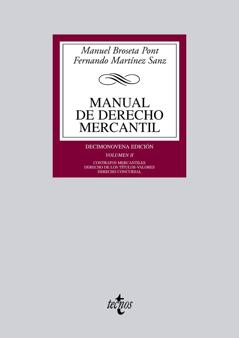 El segundo volumen de la decimonovena edición del presente Manual de Derecho Mercantil se ocupa de tres aspectos básicos de nuestra disciplina. El primero de ellos lo conforma la contratación mercantil y mercados financieros. Junto a una parte general, en la que se ha tratado de recoger los últimos movimientos de reforma en esta materia, se estudian con detalle aquellas figuras contractuales que se estiman más relevantes, sin perder de vista que nos hallamos ante un manual universitario, con lo que ello exige de sencillez y de claridad expositiva. En este primer bloque temático se incluyen las últimas reformas legislativas, como la Ley 16/2011, de 24 de junio, de contratos de créditos al Consumo. Al mismo tiempo, se ha optado por introducir en la parte relativa al Derecho del mercado de valores (capítulo 36) la regulación de las sociedades anónimas cotizadas, con las modificaciones que incorpora la Ley 25/2011, de 1 de agosto, de reforma parcial de la Ley de Sociedades de Capital y la reciente Ley 1/2012, de 22 de junio, de simplificación de información y documentación de fusiones y escisiones de sociedades de capital.