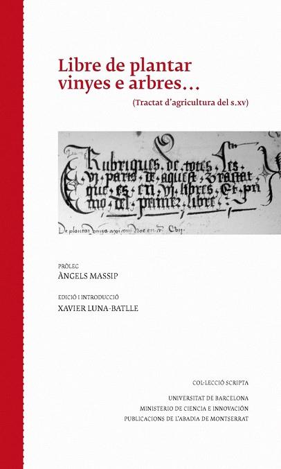El Libre de plantar vinyes e arbres...és un manuscrit del final del segle XV que un escrivà anònim del Maestrat va copiar d?una obra prèvia que desconeixem. Un tractat d?agricultura de llengua concisa, pràctica i directa que conté molts trets dialectals de les terres de l?Ebre i del nord valencià. É...