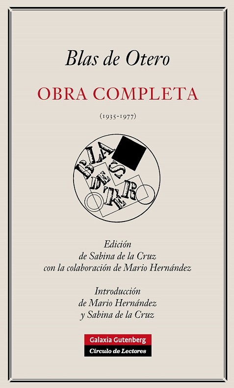 Por primera vez se reúne la «Obra completa» (1935-1977) de Blas de Otero. Este volumen unitario, de verso y prosa, acoge todos los libros que el poeta publicó en vida con otro póstumo, «Hojas de Madrid con La galerna, anticipado por esta misma editorial, y otros dos que dejó inéditos: «Poesía e Historia» (verso) y «Nuevas historias fingidas y verdaderas» (prosa). Una sucinta, y también inédita, «Historia (casi) de mi vida» rinde cuentas de obra y biografía. Un complemento de poemas inéditos y dispersos desde su primera juventud redondea la visión de la poesía oteriana, minuciosamente dispuesta por Sabina de la Cruz, su máxima estudiosa, que ha compulsado manuscritos e impresos para clarificar la obra de uno de los grandes poetas españoles del siglo xx. «Blas incita a un modo de estar o de ser, y engendra, mas nunca por la proximidad tribal de la persona, el raro vínculo de la fidelidad. Cayeron y caerán las mariposas deshojadas de las clasificaciones y las épocas. Blas es, él solo, una entera clasificación. Momento y época. Momento, nunca monumento. ¿Es Blas quizás el antimonumento? ¿Podría aguar con un brusco silencio la fiesta más solemne en su propia memoria, acaso un día declarada de interés nacional? Al fin, cuando ya haya pasado el tiempo falaz del abanico… y el muro blanco sea sólo blanco, Blas se hará más visible. Y así estará, sin pedestal ni altura, como fue y como es, como es difícil ser, secreto, verdadero, insobornable.» JOSÉ ÁNGEL VALENTE