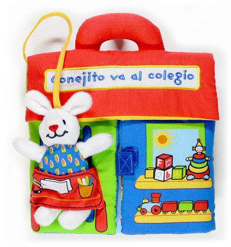 Libro para bebés con conejito de tela como complemento. Esta vez el pequeño conejo va al cole.