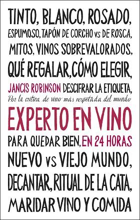 En Experto en vinos en 24 horas, Jancis Robinson comparte toda su experiencia con ingenio y accesibilidad para todos los públicos. Desde la diferencia entre un vino tinto y un vino blanco, hasta saber valorar la forma de las botellas y entender sus etiquetas, pasando por las descripciones básicas de sabor, color y olor, cómo armonizar cada vino con una comida o saber valorar correctamente la relación calidad-precio de un vino...